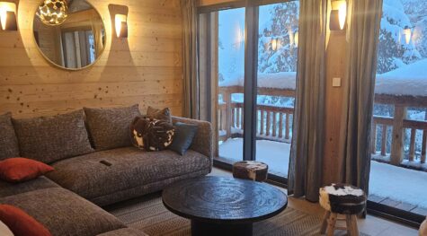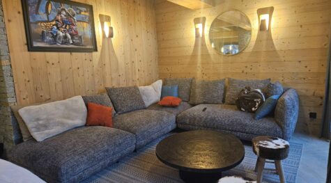 Parfait pour se détendre après une journée en montagne. L’intérieur, décoré avec des matériaux naturels et des touches modernes, crée une atmosphère chaleureuse et accueillante. De larges fenêtres laissent pénétrer la lumière naturelle, accentuant la beauté du lieu. L’espace est conçu pour offrir une sensation de confort absolu, avec un grand canapé moelleux, idéal pour des moments de relaxation en famille ou entre amis.